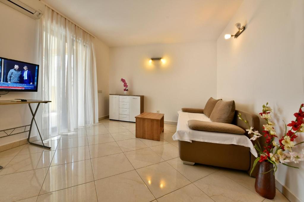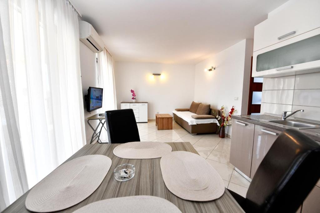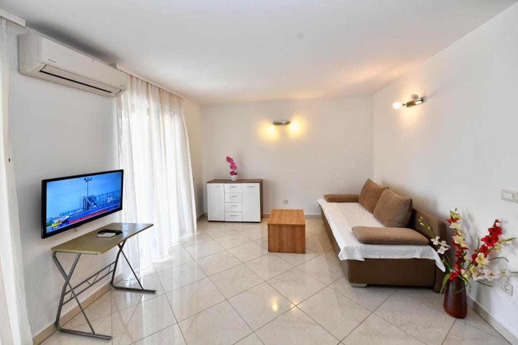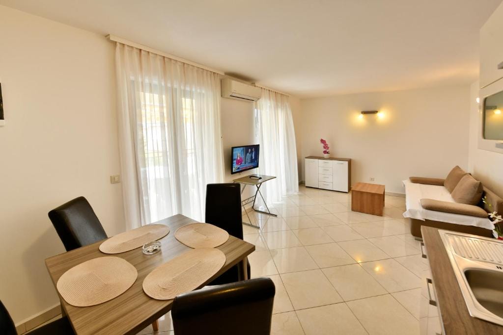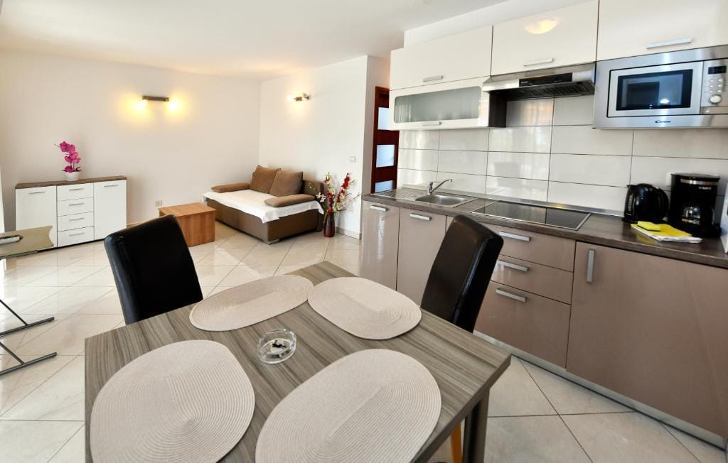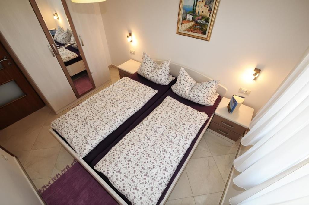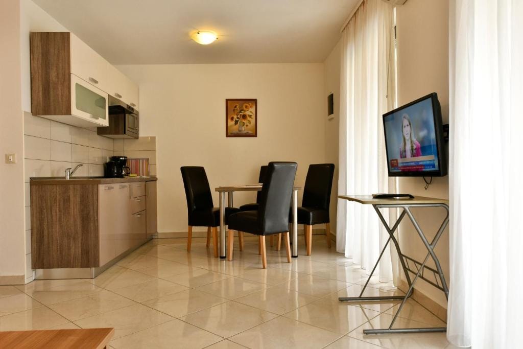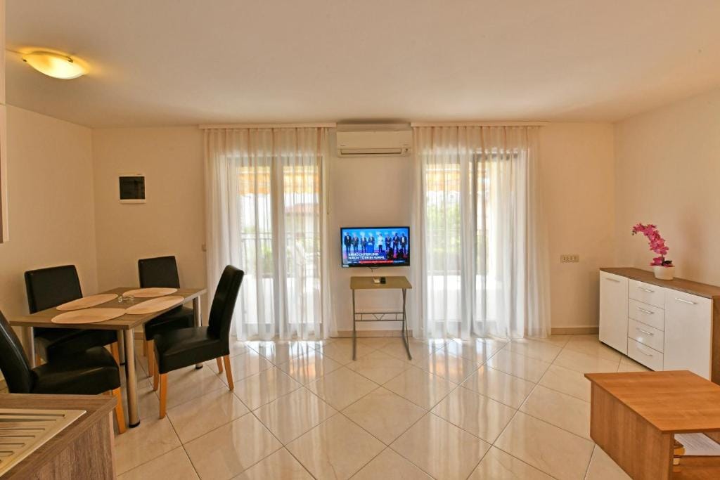 It offers a separate bedroom, living room with kitchenette and dining area with sofa bed (160 × 200). Bathroom with shower / WC available. The apartment is equipped with air conditioning, satellite TV and Internet.
