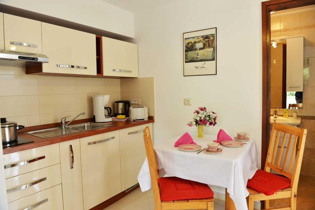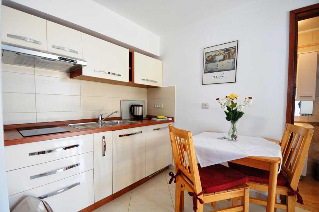 The studio room has a double bed (180×200), a fully equipped kitchen (ceramic hob, fridge with freezer compartment, coffee maker, toaster, egg cooker, kettle) and a bathroom with shower/toilet.
