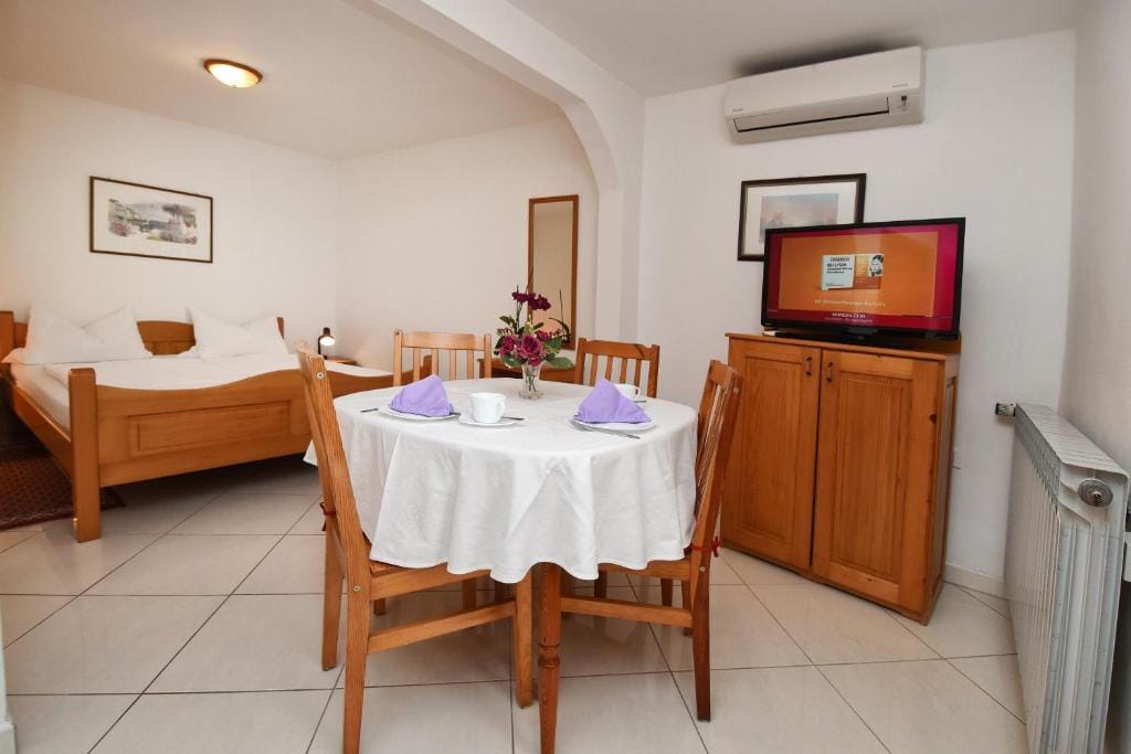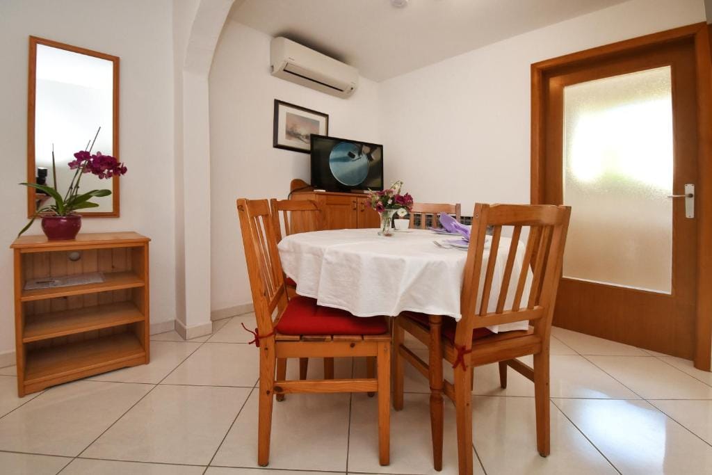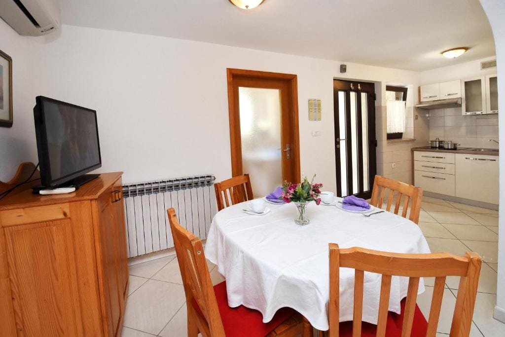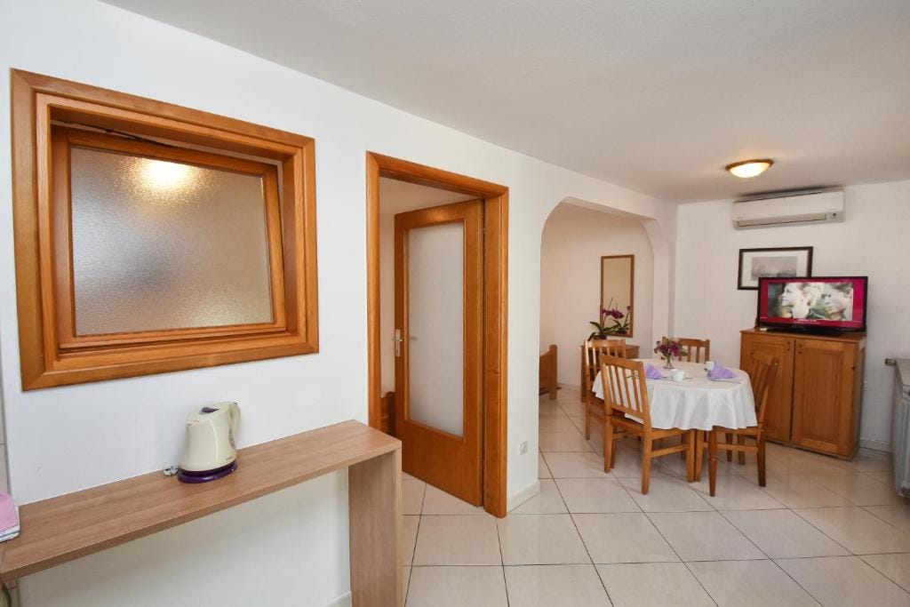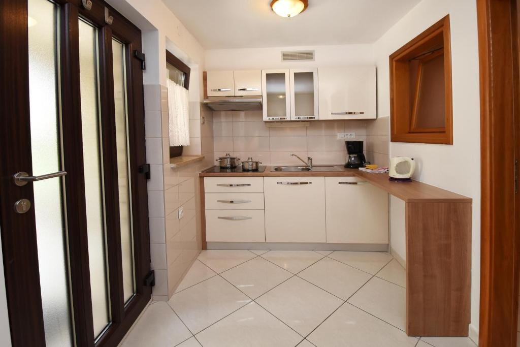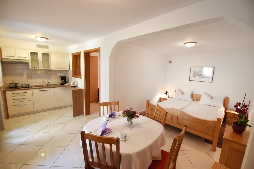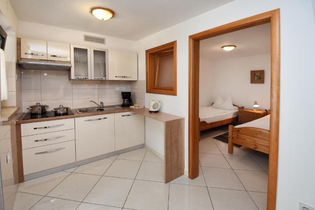 This Sutarrin apartment has a bedroom with a double bed (160 x 200), a fully equipped kitchen with dining area (electric stove, fridge with freezer compartment, coffee maker, toaster, egg cooker, kettle), and a bathroom with shower/toilet.